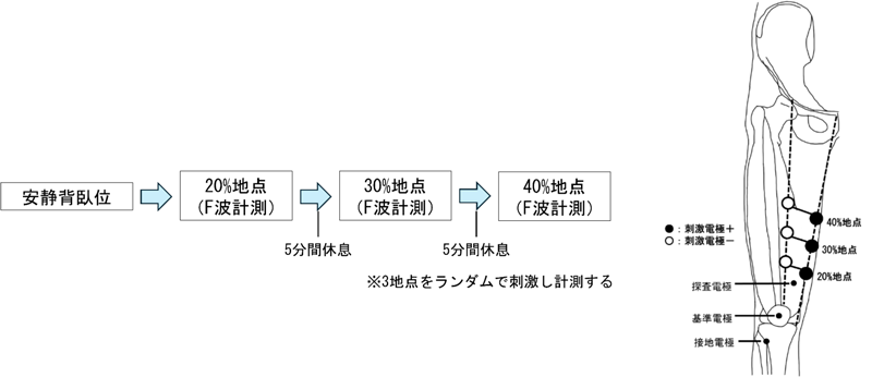 具体的には、大腿内側の遠位側から20%、30%、40%地点の3地点を設定し、どの部位で最も安定してF波が記録されるのかを比較しました(図参照)。測定には誘発筋電計Neuropack S3を用いました。