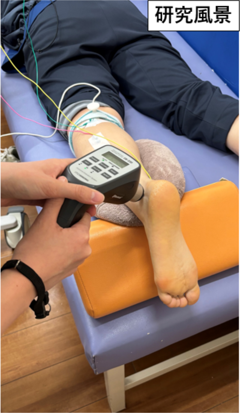 一般的な対応としては、ストレッチや水分・電解質補給が行われていますが、近年では第1・第2中足骨間に存在する深腓骨神経へのブロック注射によって、こむら返りが改善したとの報告もみられるようになりました。しかし、注射による介入は育成年代選手への適用が難しく、また非侵襲的かつ簡便に実施できる代替アプローチに関する研究報告はほとんどありません。そこで本研究では、スポーツ現場でも安全に実施可能な「圧迫刺激」に着目し、第1・第2中足骨間への圧迫刺激が、運動誘発性筋痙攣の予防・改善に寄与する可能性について検討しました。筋痙攣の発症には筋緊張状態が関与すると考えられていることから、本研究では筋硬度を主要な評価指標として研究を進めました。