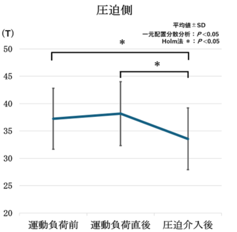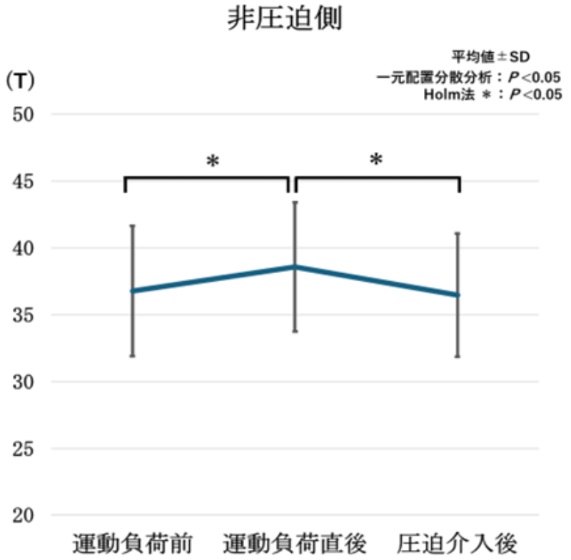 特に、圧迫刺激を行った圧迫側の下腿三頭筋では、安静側と比較して筋硬度が有意に低下することが明らかとなりました。