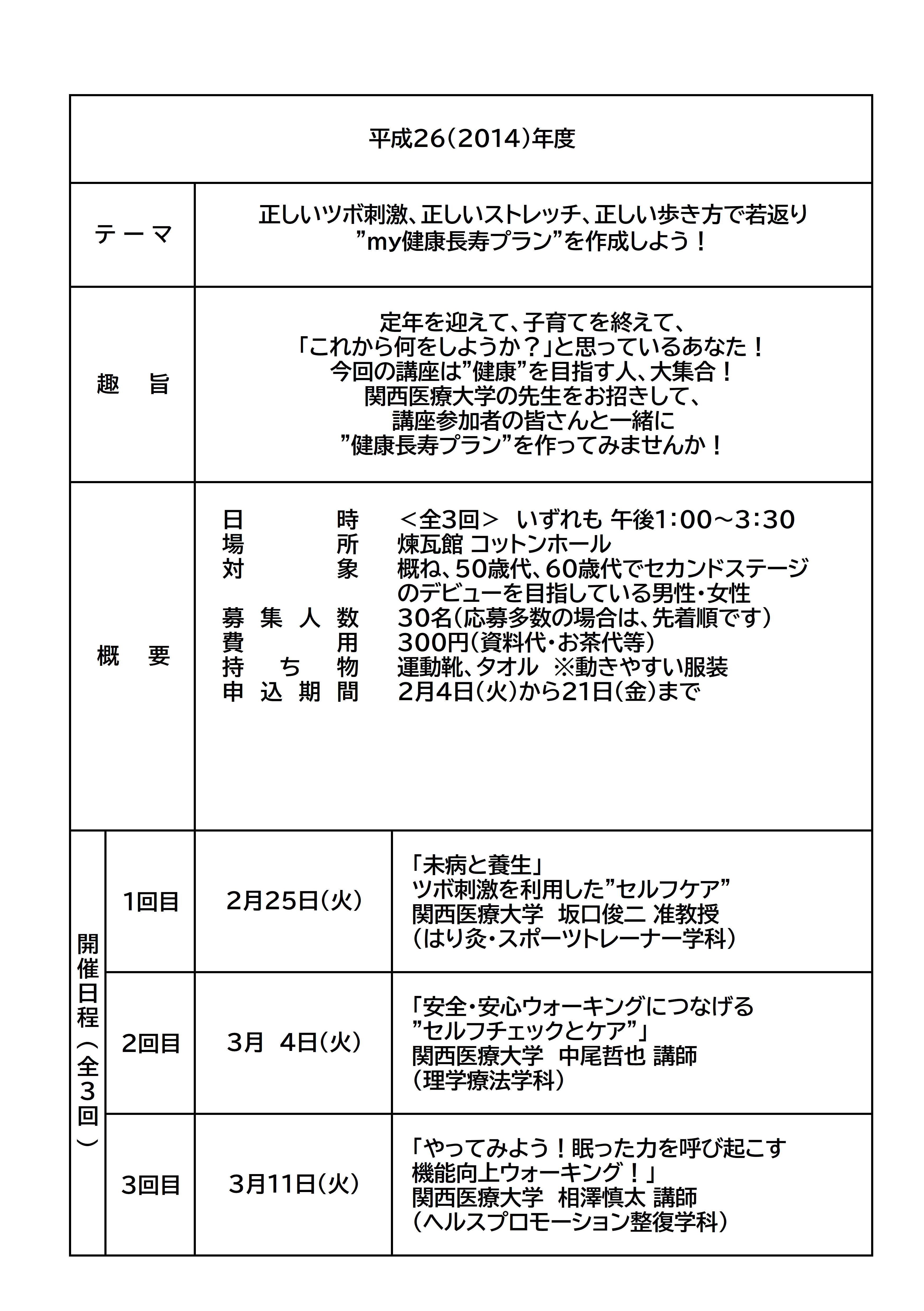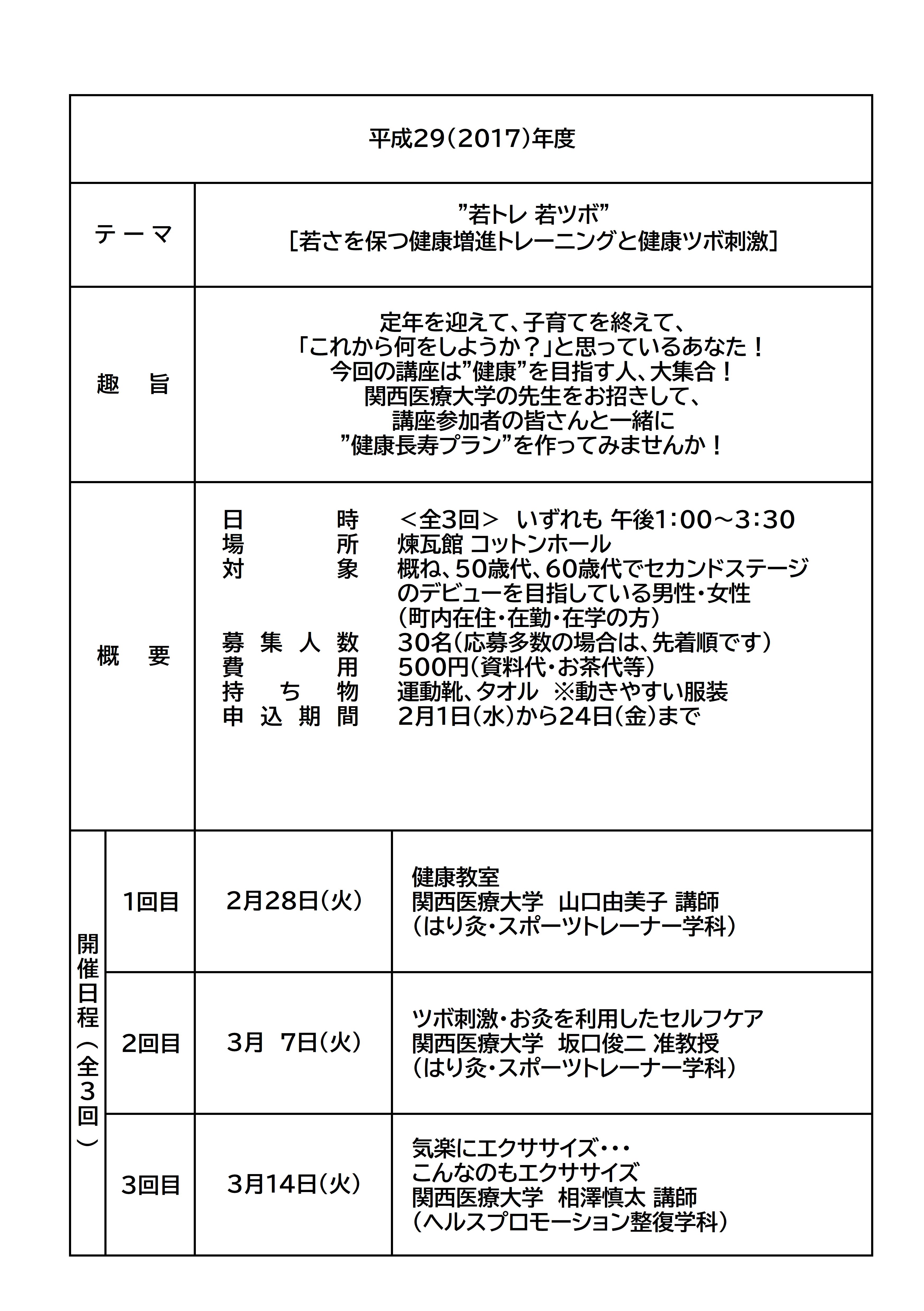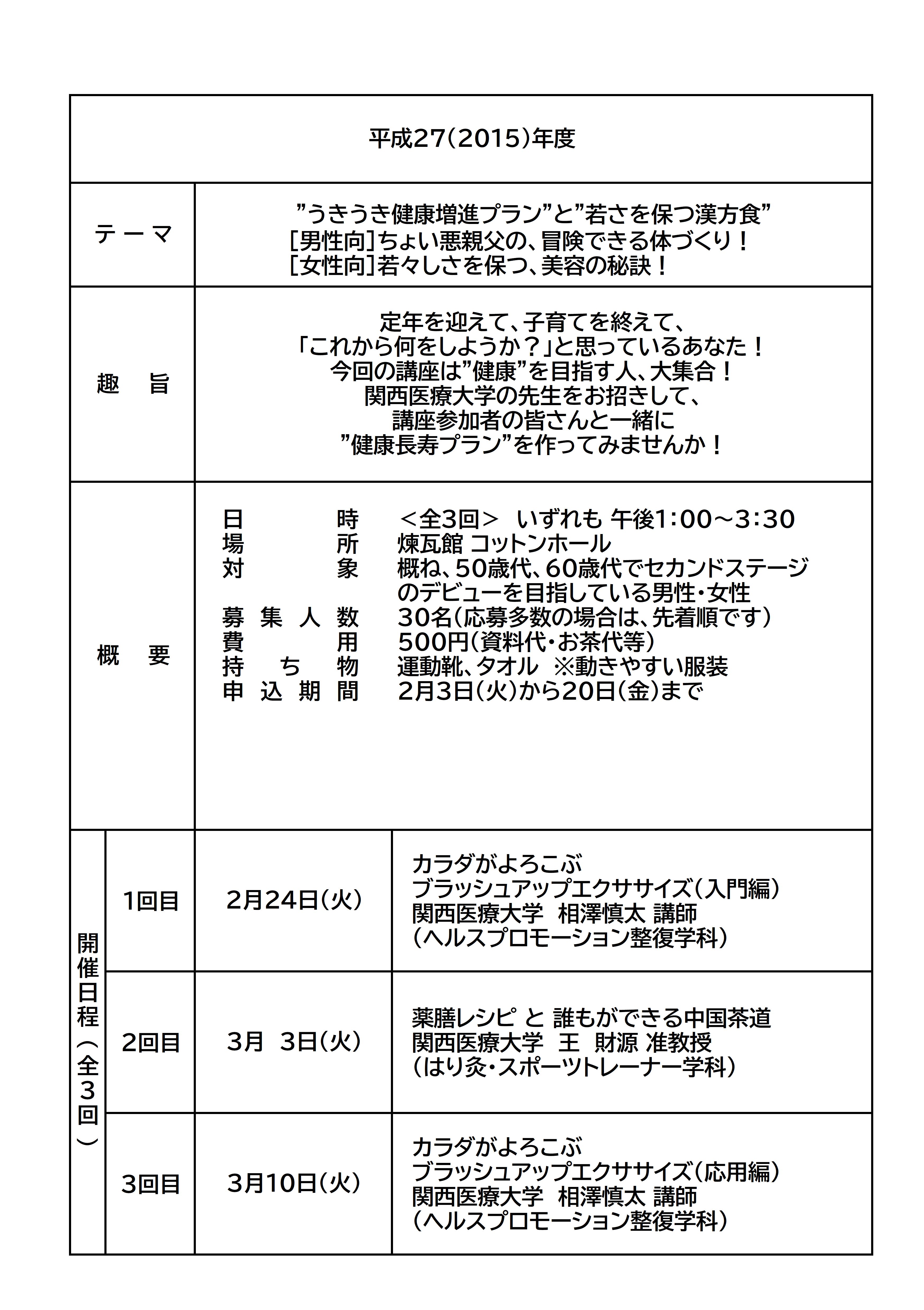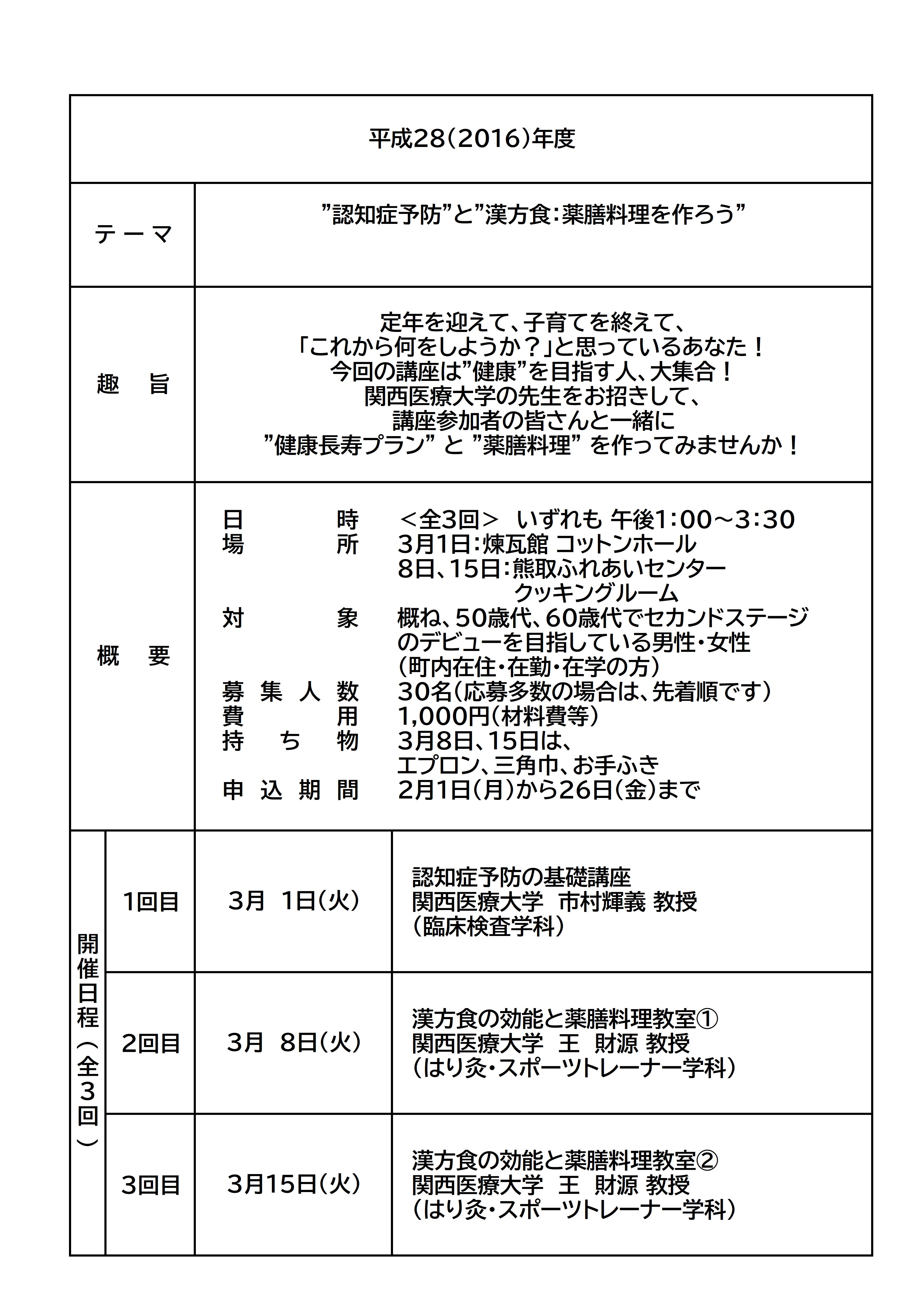 平成16年度から「熊取ゆうゆう大学」(町民大学)を開学しており、セカンドステージにおいて「何をしたらいいのか?」を模索している人のために講師による講演、セカンドステージを楽しんでいる地域住民の体験談をもとに参加者相互の意見交換を通じて「やりたいこと」の入口をみつけられるよう、きっかけづくり支援を目的とする。