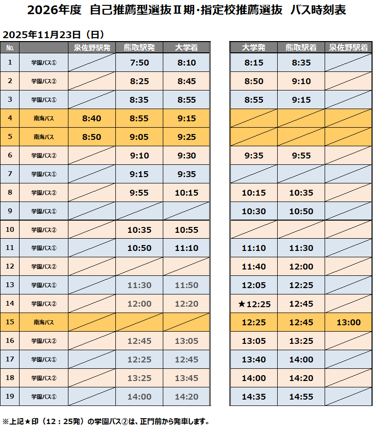 11/23(日)2026年度自己推薦型Ⅱ期・指定校制推薦選抜における臨時バス運行についてお知らせします。