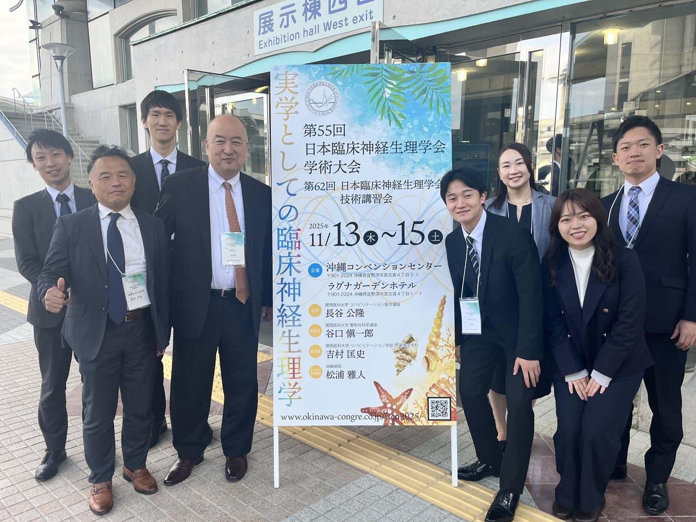 2025年11月13日から15日にかけて、第55回日本臨床神経生理学会学術大会が沖縄コンベンションセンターで開催されました。学術大会では、理学療法学科の東藤真理奈講師がシンポジストとして登壇し、福本悠樹講師に加えて、大学院生の桂木さんと中山さん、準研究員の黒部さんと長谷さんが一般演題の発表を行いました。さらに、副学長の鈴木俊明教授は教育講演にて講演を行いました。詳しくは下記をご参照ください。医師を中心とした学術大会で、理学療法士がしっかりと発表を行い活躍する姿は、後進にとっても非常に刺激になったと思います。