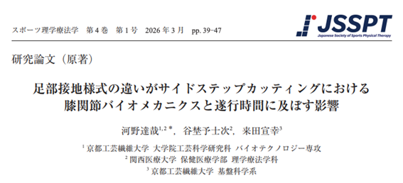 河野達哉,谷埜予士次, 来田宣幸: 足部接地様式の違いがサイドステップカッティングにおける膝関節バイオメカニクスと遂行時間に及ぼす影響. スポーツ理学療法学. 2026; 4 (1): 39–47.