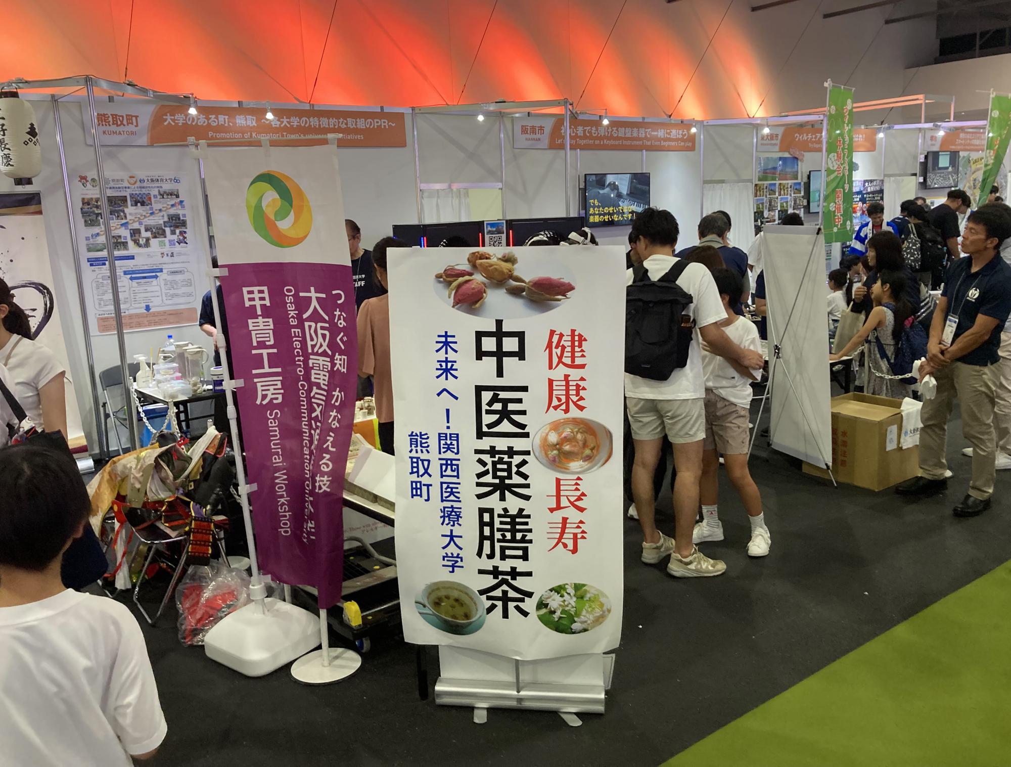 また、同じブース内で大阪観光大学がVR技術で観光を楽しむ体験、大阪体育大学は熊取町との取り組み「官学連携体験型事業」をポスターと映像で紹介されました。翌日9月15日(祝・月)には、京都大学複合原子力科学研究所が放射線に関する体験を出展され、熊取町と四大学の連携ができました。