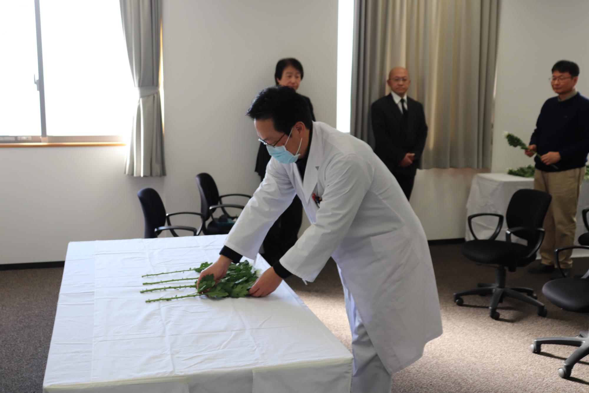 はじめに伊東学長より研究・教育の発展が、尊い動物の命の犠牲の上に成り立っていることを再確認し、改めて研究・教育に真摯に取り組むことを誓う慰霊の言葉が述べられました。その後、参列した教職員並びに学生による黙祷・献花を行い、犠牲となった実験動物達に哀悼と感謝の意を捧げました。