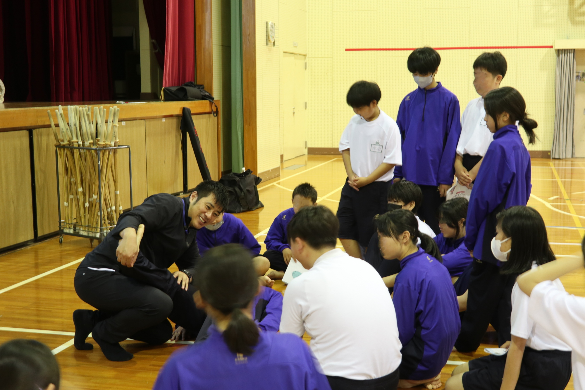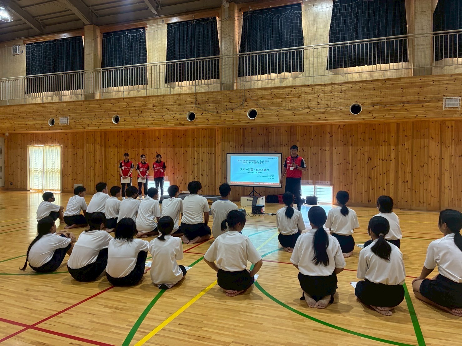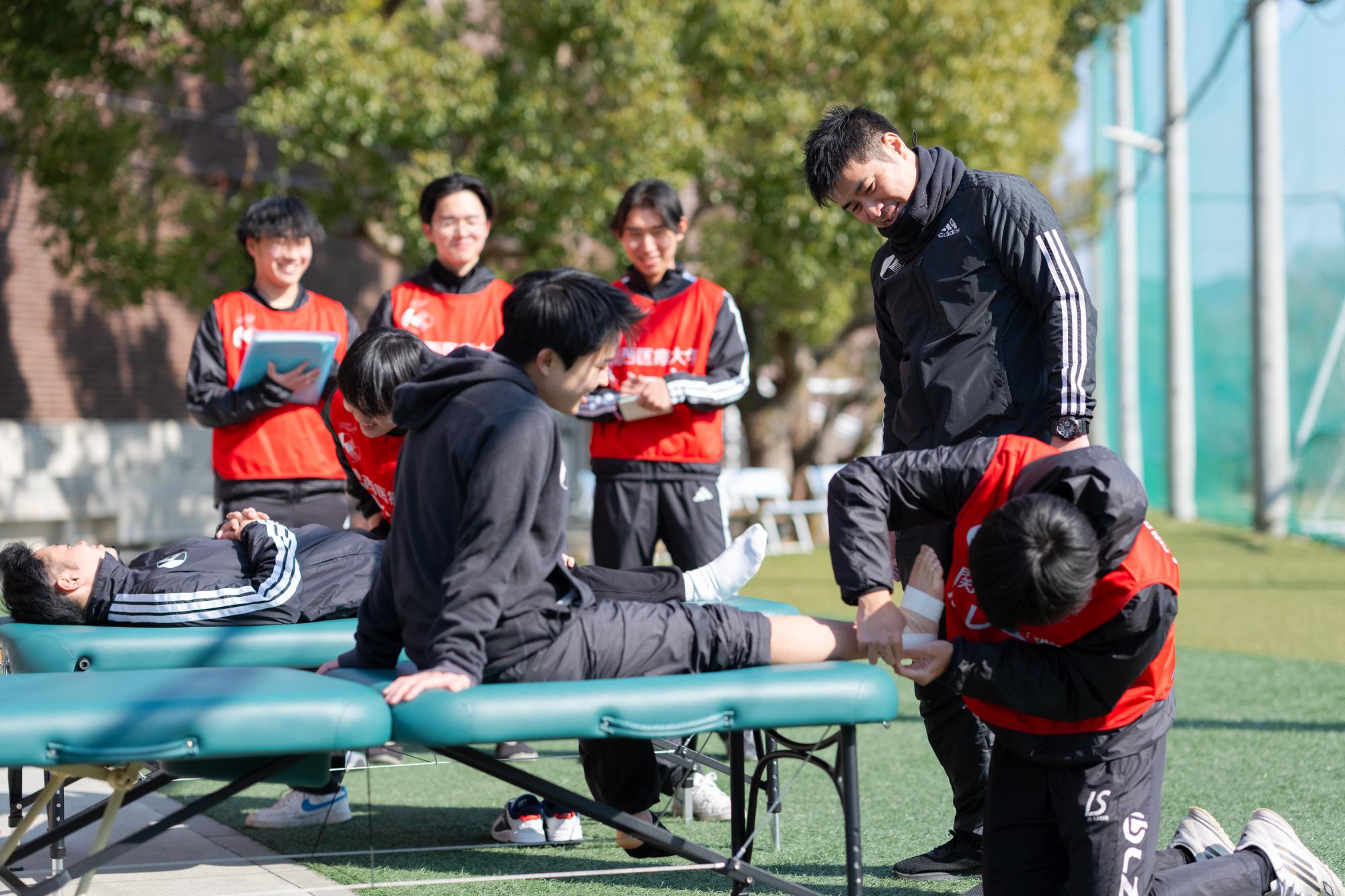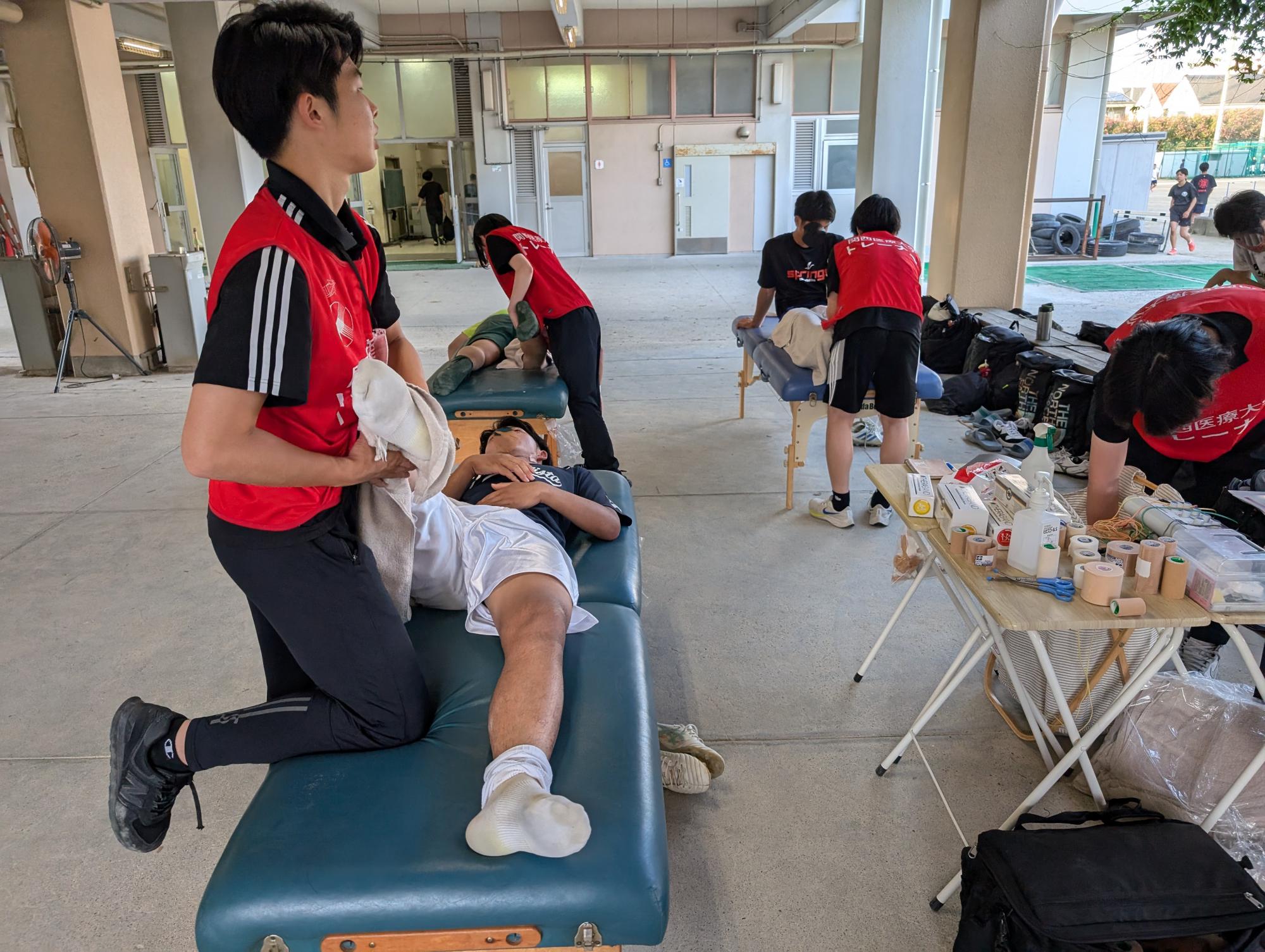 寺岡祐助講師のてらゼミでは、スポーツ活動に関わる人々(顧問の先生や養護教諭の先生)、更に選手自身が「スポーツ医・科学」の知識を持つことが重要だと考え、多くの中学校や高校に訪問して、ケガの予防や身体のしくみに関する講義を実施しています。ある高校では、全ての部活の生徒が相談可能なトレーナーブースを設置しています。生徒達のケガなどの身体的な相談に対して、テーピングやストレッチ、トレーニング指導などを提供できる環境を整え、生徒たちをサポートしています。この活動は、中学や高校の生徒の悩みを解決するための取り組みですが、活動に参加している大学生の成長にも繋がる取り組みとなっています。競技レベルに関わらず、「スポーツ医・科学」の情報が行き渡る世の中を目指して取り組んでいます。